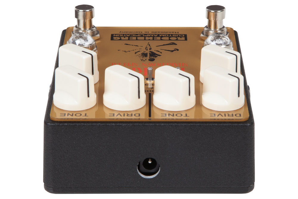 Dieser Sound hat einen Namen: Tyler Bryant. Zwei Custom Overdrive Pedale in einer Box und ein angezerrter Verstärker, mehr braucht Tyler für seinen Sound nicht. Für Rhythmus spielt Tyler den linken Overdrive im High Gain Boost (909 Kippschalter An), für Solo der rechten Overdrive dazu in Reihe geschaltet, fertig. Zwei separate Bass Boost (Kippschalter), für jedes Overdrive Pedal getrennt, pushen die tieferen Frequenzen, ohne dass der Sound matschig wird.