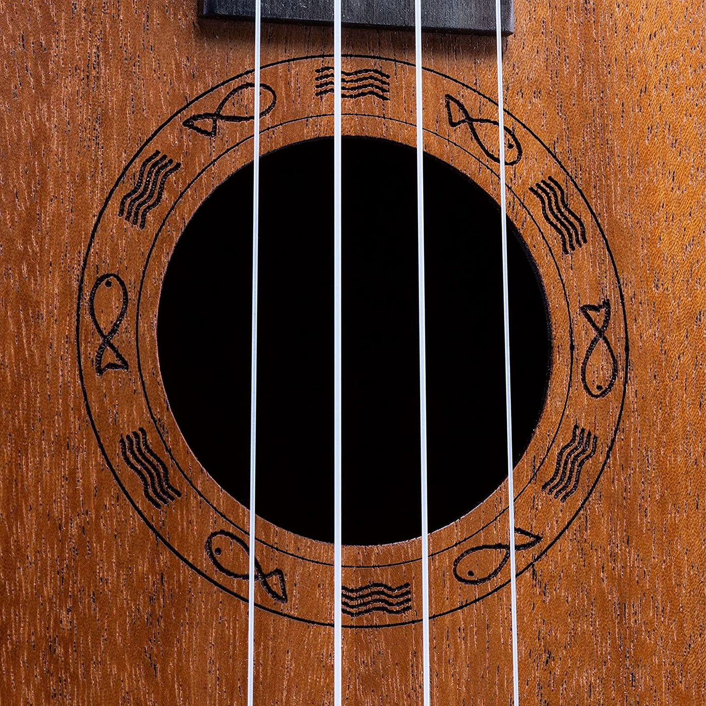 Schönes Design: Die qualitative Mini-Gitarre zieht direkt alle Blicke auf sich und macht mit ihrer attraktiven „Fish & Wave“ Schalloch-Gravur auch noch überall eine gute Figur.